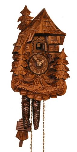 Hand carved cuckoo clock with quartz movement. The clocks are of superior German quality and are made of only genuine wood (linden and pine). The clock has shut off strike side and is 14.5 inch in size. Detailed hand carving makes it a beauty in itself which will gather praises. Battery is not included.
