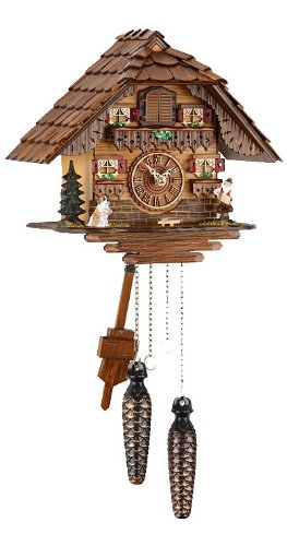 Original one day mechanical movement colored cuckoo clock with dancing figures and 2 songs. The clocks are of superior German quality and have solid top clamps. The clock case is made of genuine black forest pine. The clock has shut off strike side and is 14 inch in size. Detailed hand carving makes it a beauty in itself which will gather praises. Battery is not included.