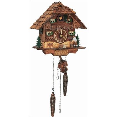 Q75/9 Classic cuckoo clock! Features: -Intricately carved woodchopper, dog and trees.-Animated woodchopper.-Twelve Swiss melodies: ''Happy Wanderer,'' Edelweiss,'' ''Dr. Zhivago,'' ''Swan Lake,''He Was Beautiful,'' '' Lorelei,'' '' Home Sweet Home,'' ''Sound of Silence,'' ''Clementine,'' ''The Entertainer,'' Love theme of the movie ''The Godfather'', and ''For Elise''.-Wooden hands and dial.-Night time shut-off feature.-Quartz movement (battery operated). Construction: -Service friendly with reliable, quality-oriented construction. Color/Finish: -Antique stain with lighter accents. Dimensions: -Overall dimensions: 10.2''H x 10.2''W x 6.7''D.