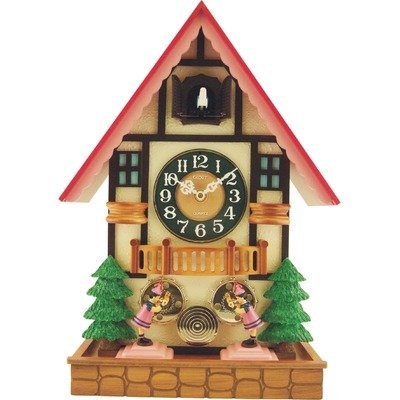 • Miniature quartz swinging doll cuckoo clock with Westminster chime.