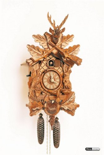 Colour: Almond colored Height: 39 cm/15.4 inch Width: 22 cm/8.7 inch Depth: 19 cm/7.5 inch Carved cuckoo clock with dear-head, rabbit and pheasant. Wooden dial, wooden hands, wooden bird, and night shut off 2 years product warranty This cuckoo clock has an exclusive life-like wooden handpainted cuckoo. With certificate of authenticity from the Black Forest Clock Association (VdS). It has a mechanical REGULA movement from the marketleader SBS-FEINTECHNIK in the Black Forest/Germany. This is a extreme long-life rack strike movement. It allows turning the hands left and right without endangering the mechanics of the movement. The 8 day running time movement need to be wind up once a week, that means you pull on the chains until the weights are up. The size refers only to the clock, without pendulum and weights.