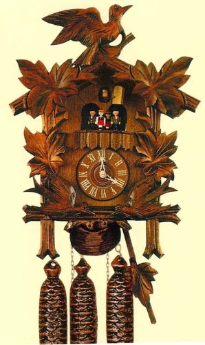 Basic style cuckoo clock with moving birds feeding their young in the nest as the cucko calls. Two tunes play alternately at each hour. Manual night off lever.
