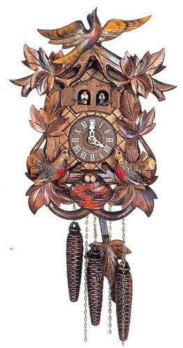 Original one day movement cuckoo clock with moving wild turkeys. The cuckoo clock also has double door and music. The clocks are of superior German quality and have solid top clamps. The clock case is made of genuine black forest pine. The clock has shut off strike side and is 12 inch in size. Detailed hand carving makes it a beauty in itself which will gather praises. Battery is not included.